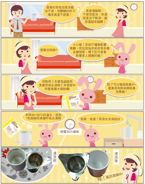 .食器杯垢專用清潔劑,除菌、除垢、除臭,一次完成。